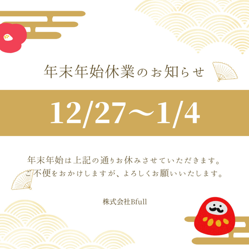 平素よりBfullをご愛顧頂き、誠にありがとうございます。 誠に勝手ながら、下記の通り年末年始休業とさせていただきます。